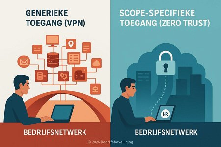 Bij scope-specifieke toegang wordt gewerkt volgens het Zero Trust-model: “nooit standaard vertrouwen, altijd controleren”. Er is geen gedeeld intern netwerk waar men zomaar op belandt. Elke aanvraag voor een bestand of actie wordt apart getoetst aan het beleid. Waar generieke toegang breed en statisch is, is scope-specifieke toegang smal en aanpasbaar. Dit verschil speelt een grote rol bij het tegengaan van ransomware, die vaak misbruik maakt van de ruime toegang die generieke verbindingen geven.